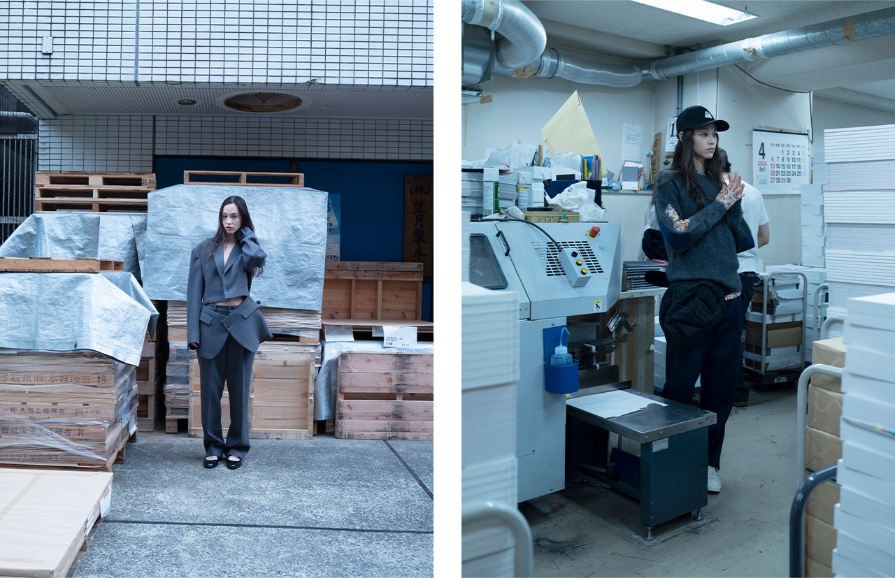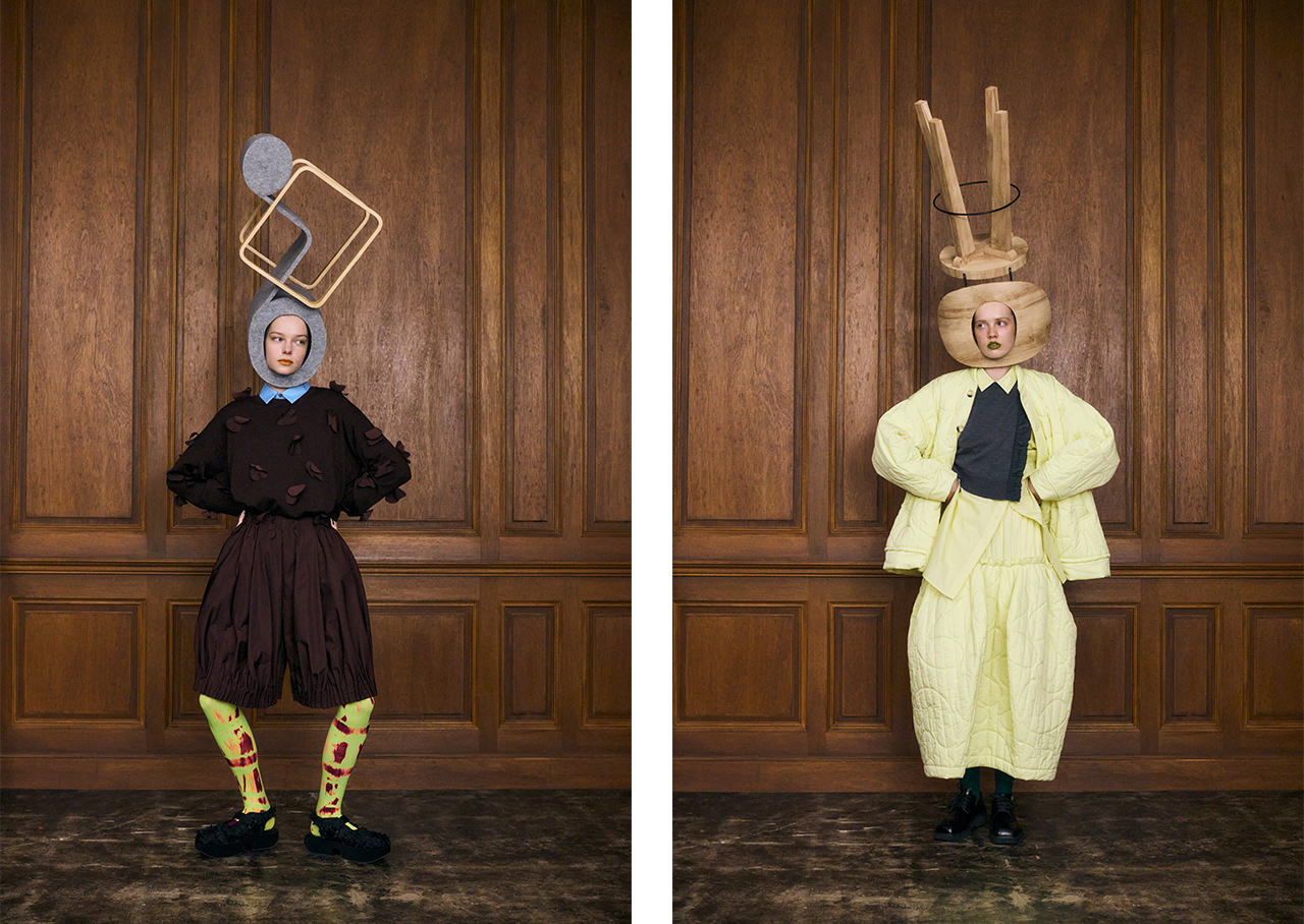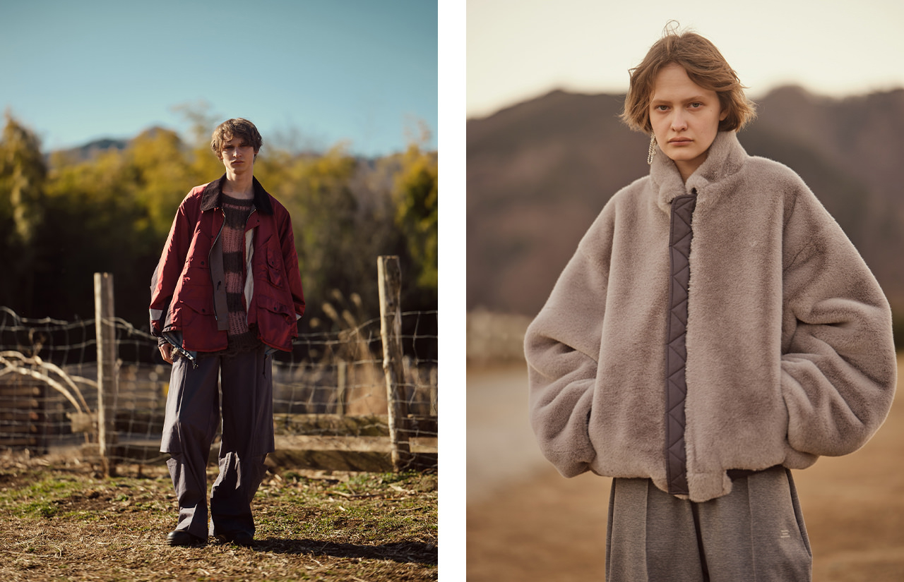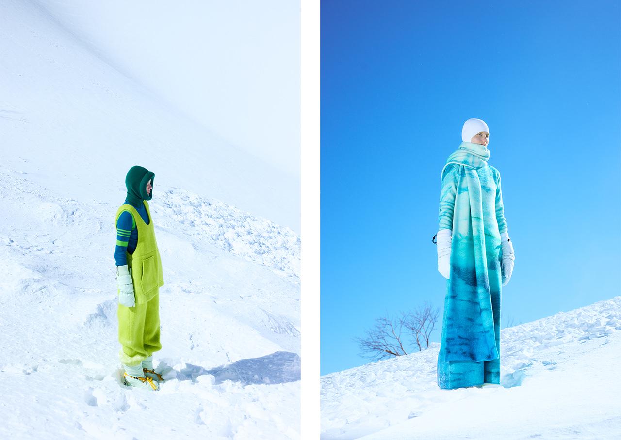 「ENFÖLD」のAWコレクションは、毎日の暮らしに欠かせない椅子がインスピレーション源。名作チェアの流れるようなラインや構造美が際立つシルエット、人間工学に基づいて設計されたゲーミングチェアの鮮やかな配色など、思想や時代背景、感性が込められたさまざまな椅子を起点に、モダンで構造的なレイヤードルックを提案する。一方で、「någonstans」は“雪山”をコンセプトに、日本アルプスの織りなす美しい稜線をイメージ。冬になり雪で覆われた山の厳しく壮大な景色の中で、動物のように擬態する色、登山家のようにカラフルな色の遊び心に富んだルックを展開する。