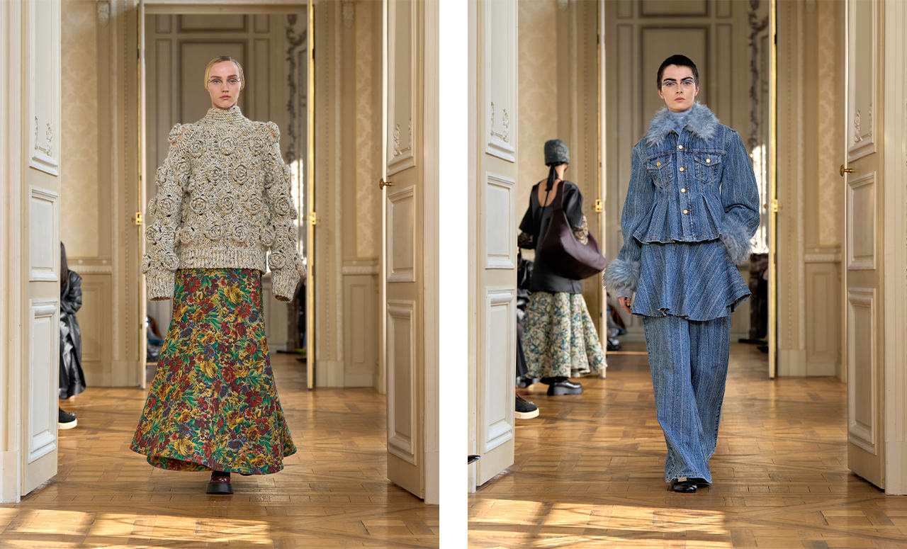ドイツの芸術家アンゼルム・キーファーから影響を受けた2025AWコレクション。彼の作品には第⼆次世界⼤戦直後の記憶が⾊濃く表現されており、それらと交錯するようなミリタリーウェアを展開。当時の軍服の袖のパターンを拡⼤解釈し、極端にラウンドさせたシェイプを採⽤。また、作品に登場する“錆”や“黴”をテキスタイルへと落とし込み、プリントやジャカード、職⼈の手仕事によるレザーのヴィンテージ加⼯で重厚かつ退廃的な雰囲気を強調する。ウィメンズも彼が表現してきた⼥性像に着⽬し、コルセットラインやパニエのヴォリュームなど、18世紀末ヨーロッパの装いをモダンに解釈。