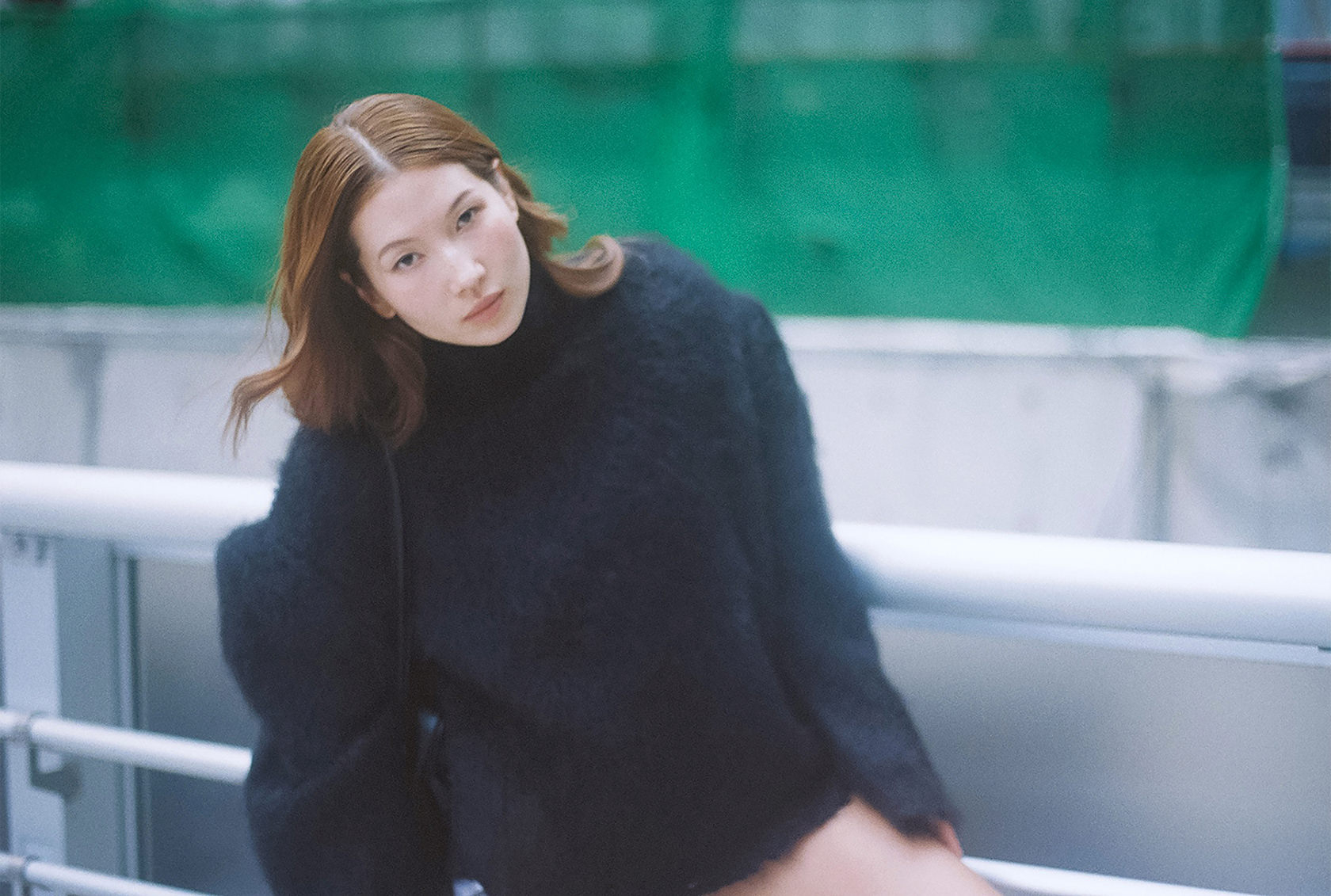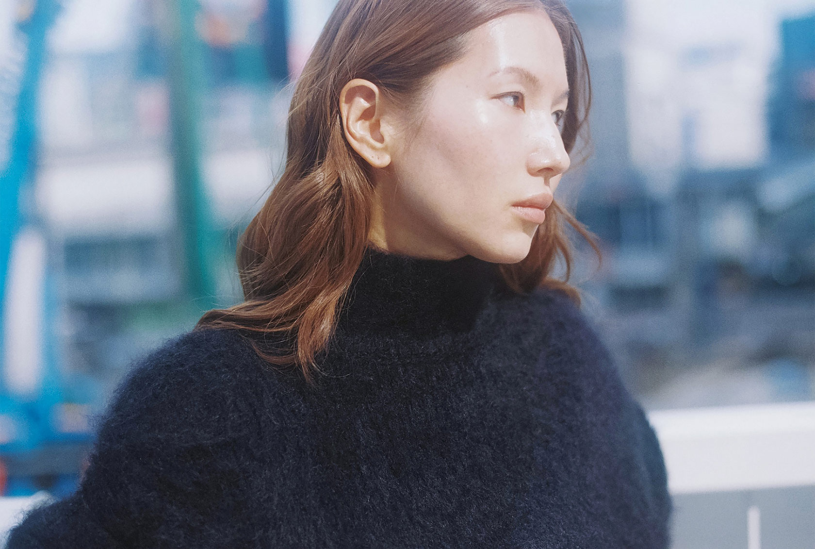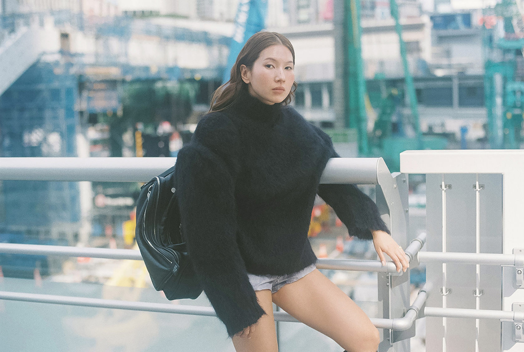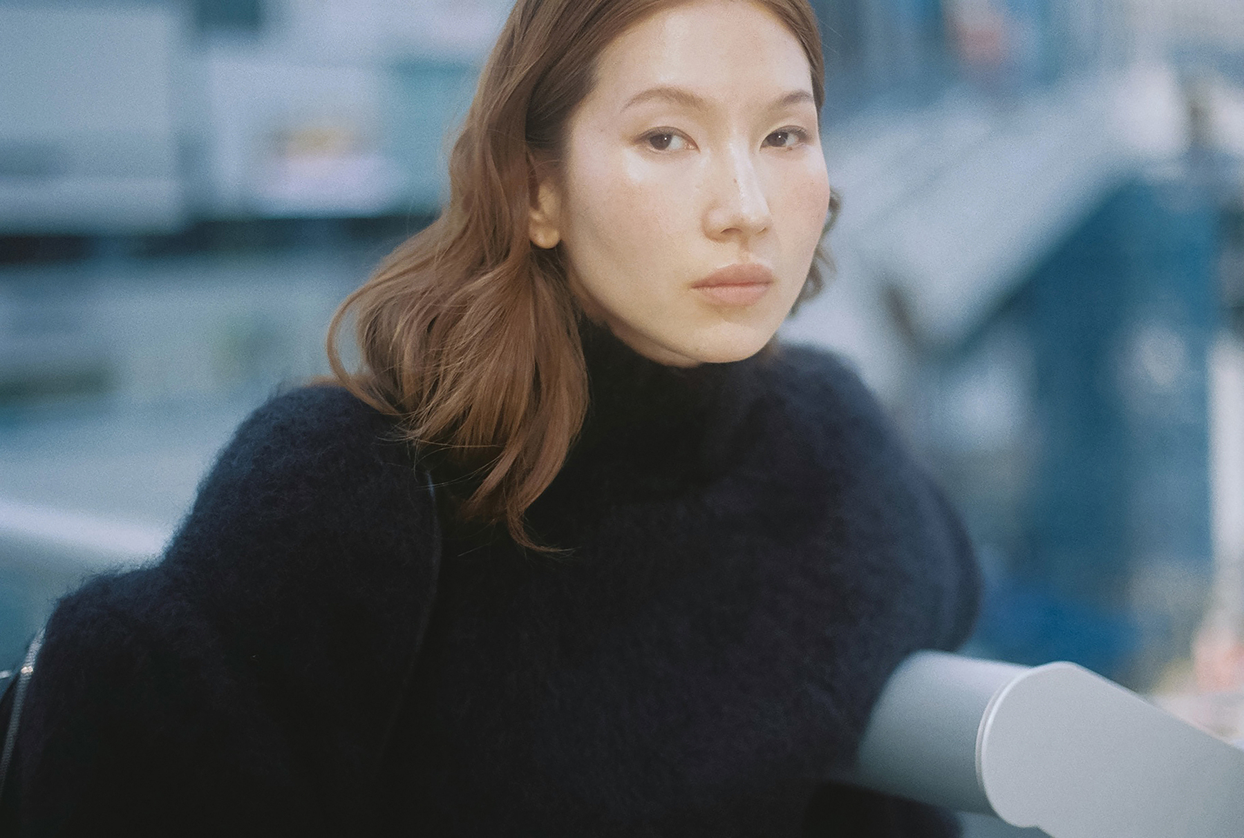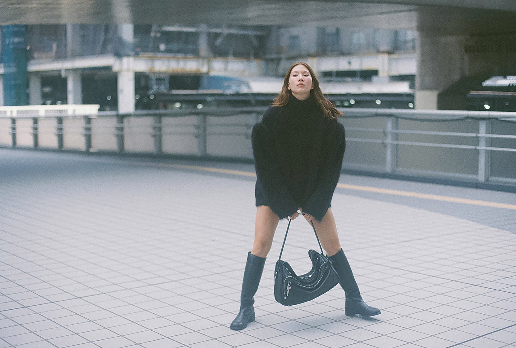 朝8時30分。渋谷の街に朝の光がゆっくりと差し込み通勤の人々の気配が漂う中、菊乃さんは静かに街に佇み…Acne Studios 25年秋冬のふわりとした風合いのパッド入りウールニットを纏って、ファッションシューティングを。手に持ったバッグは、クリエイティブ・ディレクターのジョニー・ヨハンソンがキャリアの初期に大型ポラロイドカメラとレンズを運ぶために使用していたバッグから着想を得た、機能性と実用性を兼ね備える「Camero Bag」だ。