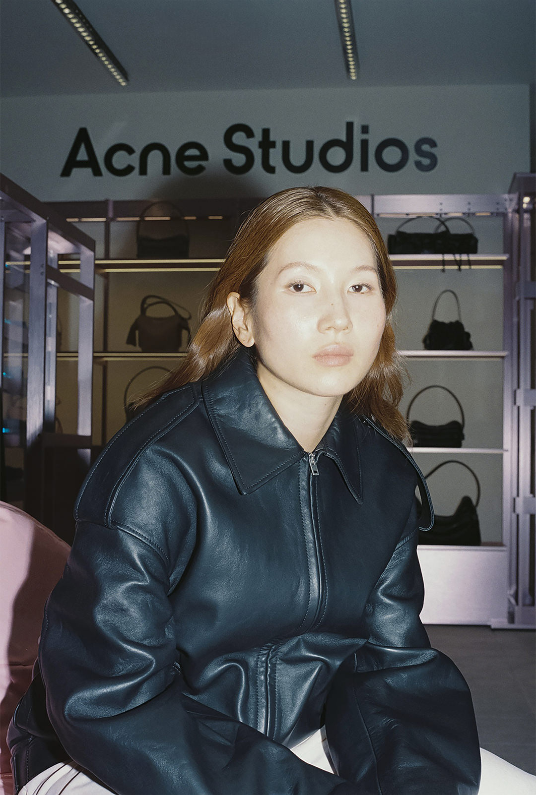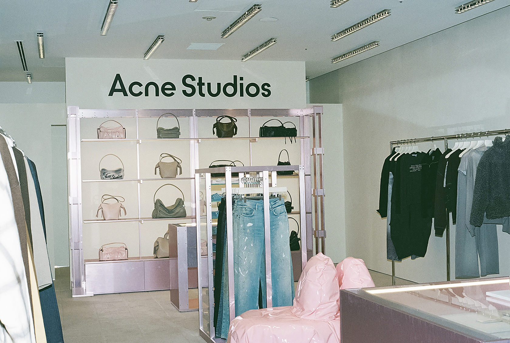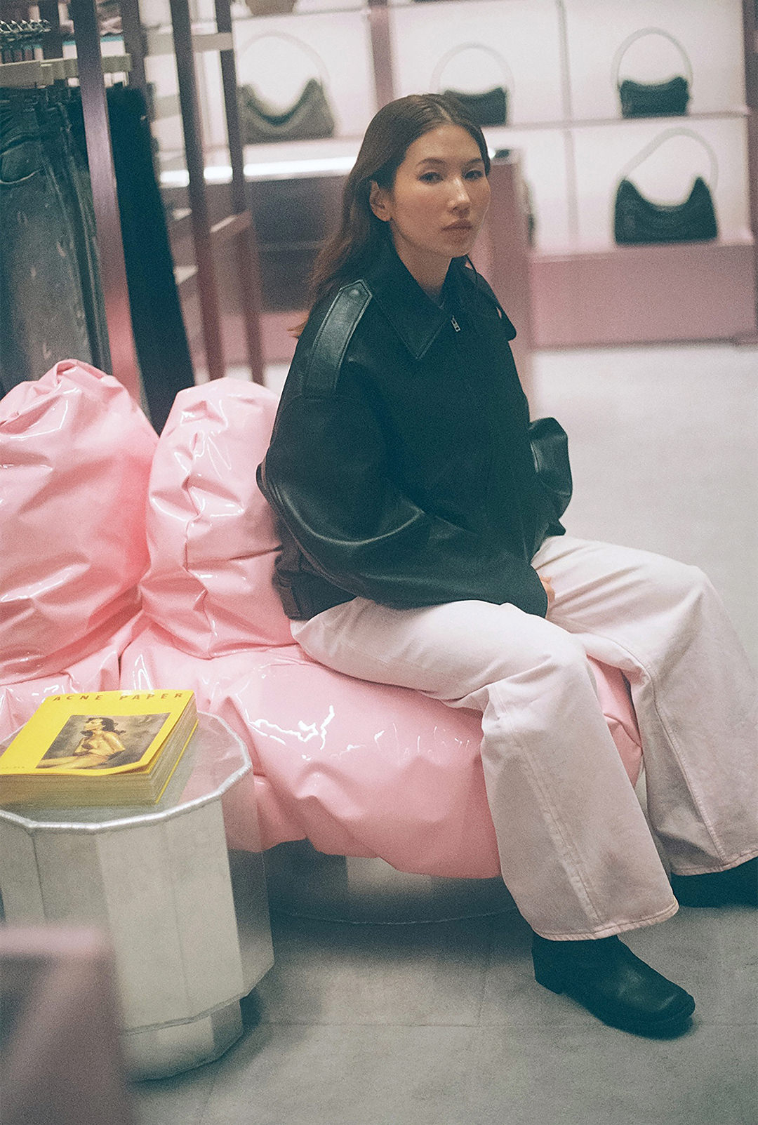 今年5月、渋谷PARCO 2FにAcne Studiosのショップがオープン。約70平方メートルの広々とした店内は、ブランドのシグネチャーカラーであるソフトピンクを基調とした温かみのある空間で統一されている。菊乃さんが座るピンクのソファーは、世界的に著名なデザイナーのマックス・ラムによって制作された。ブランドの洗練された美学と東京のエネルギッシュなカルチャーが融合した象徴的な空間として注目を集めている。