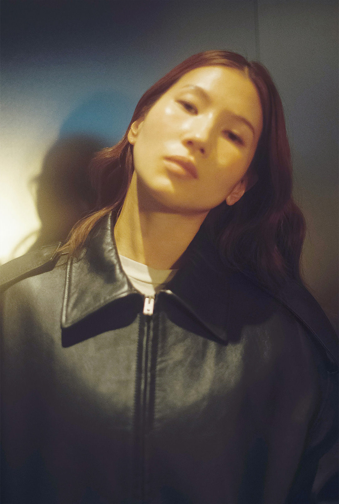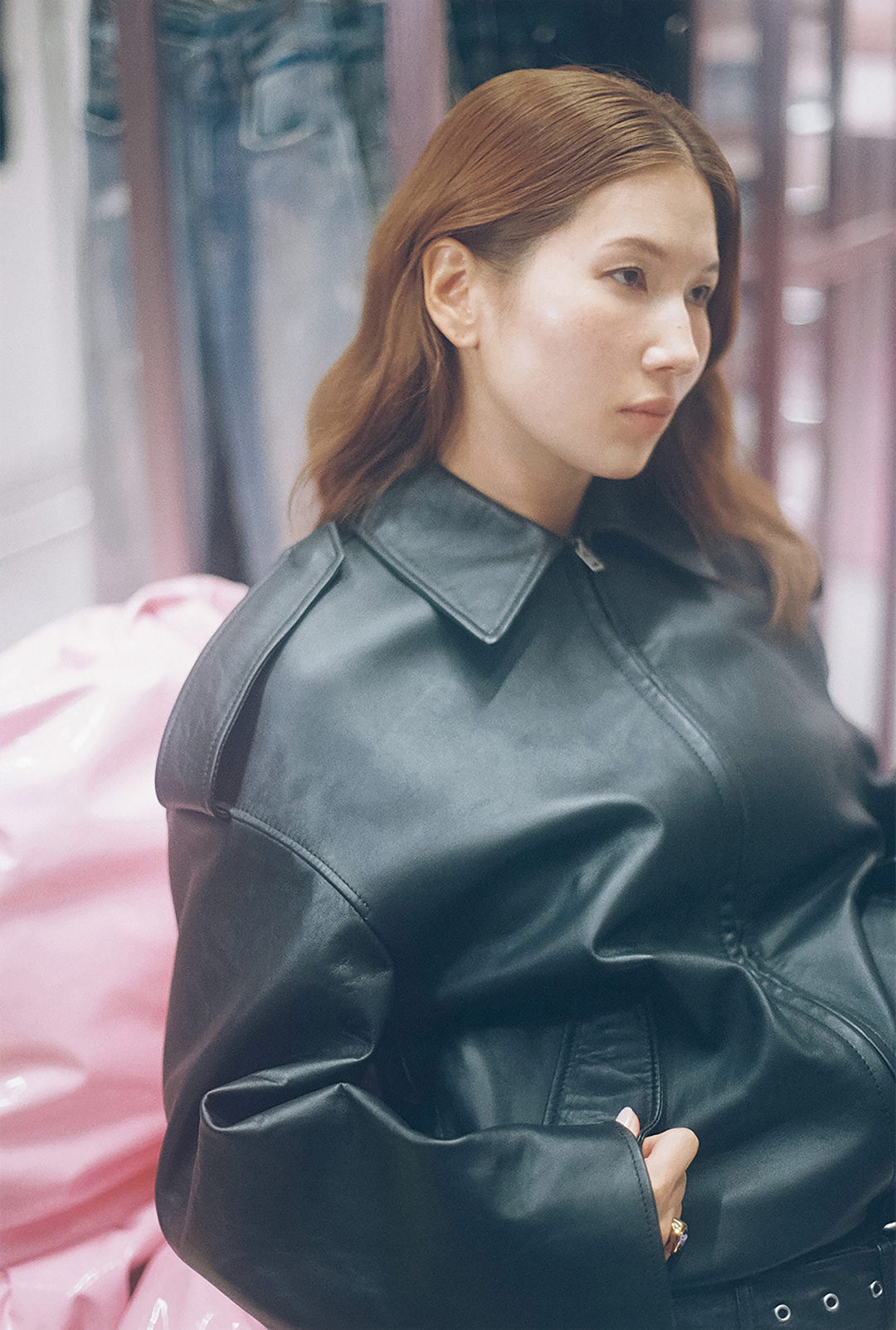 菊乃さんが着用するのは、ドロップショルダーに仕立てたレザーのバイカージャケットと、ブランドを象徴するソフトピンクの「1981ジーンズ」。デニムが醸し出すヴィンテージ感は、手作業によって施されたピンクカラーのスプレーと汚れ加工によるもの。