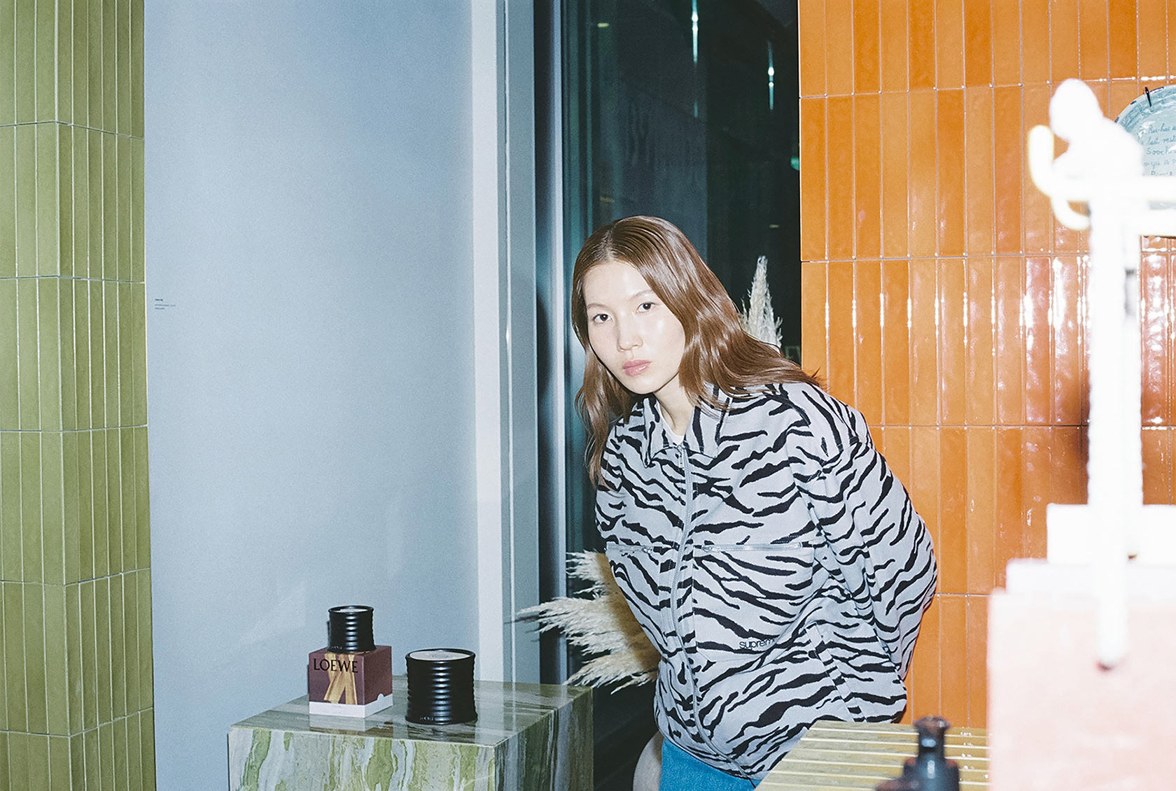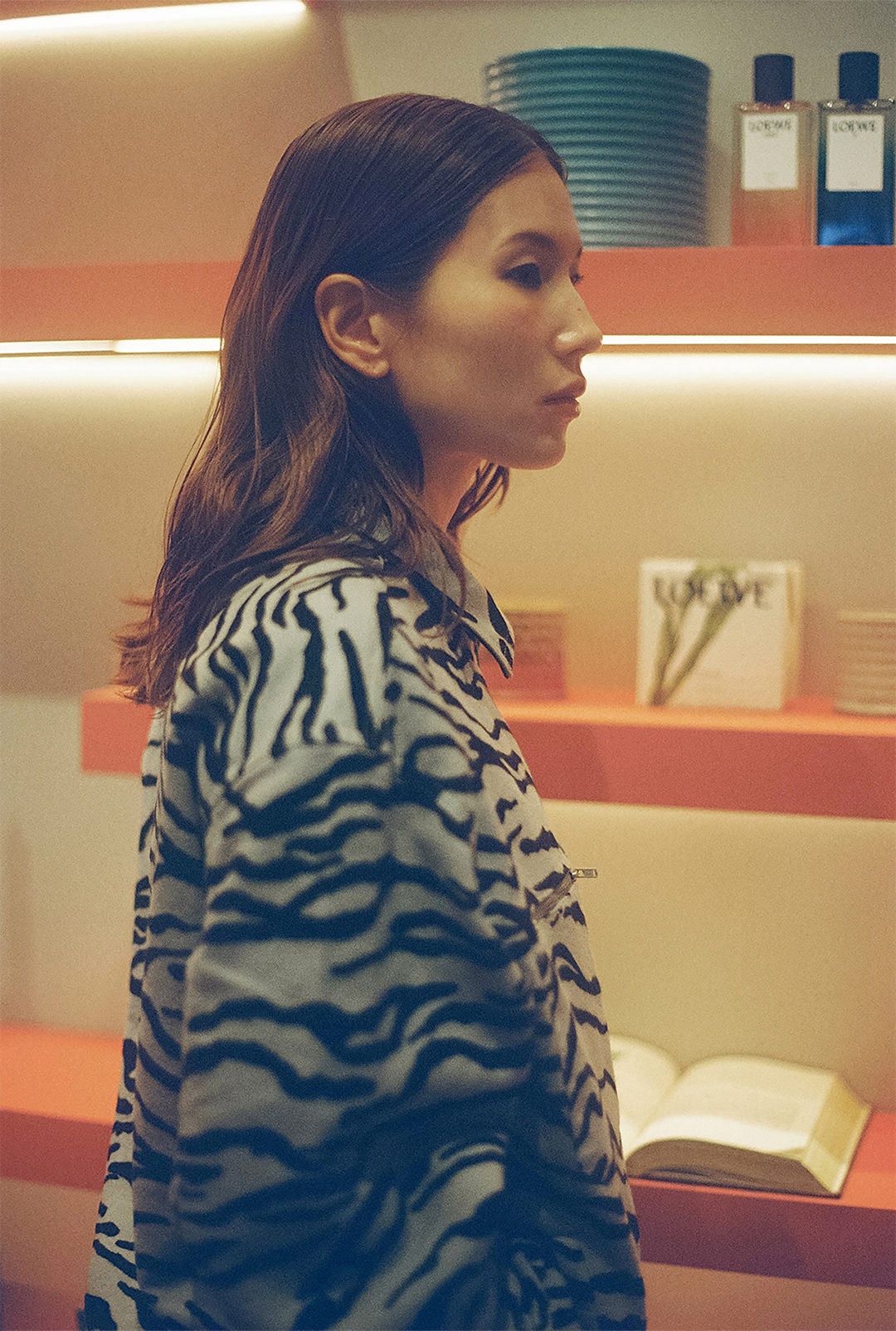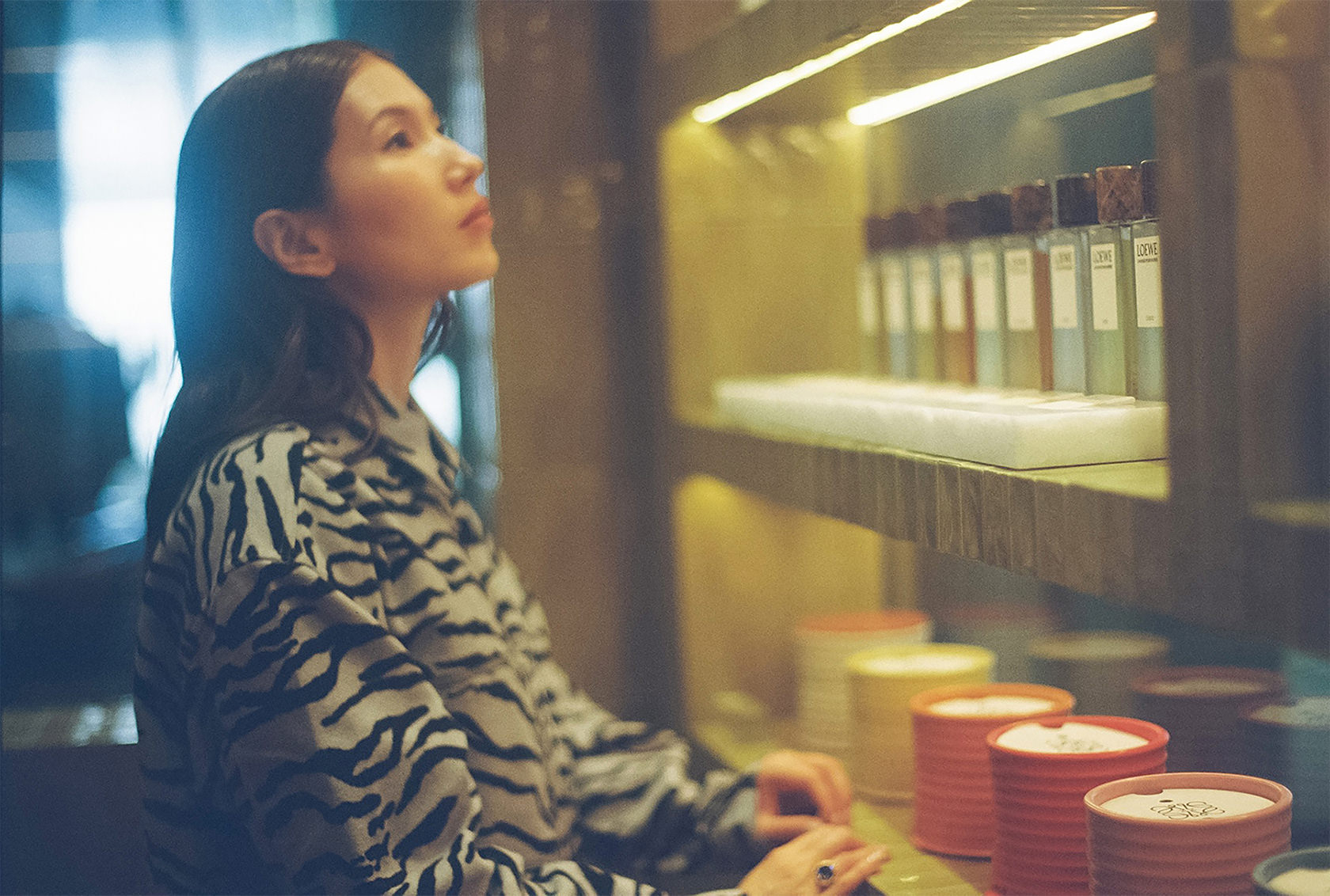 ショップには、香りの世界をライフスタイルで楽しめる多彩なアイテムが揃っている。菊乃さんのプライベートでも馴染みのあるフレグランスは、マドリードの街と人の記憶を香りに映し出す「LOEWE Un Paseo por Madrid Doré(ロエベ ウン パセオ ポル マドリード ドーレ)」。マドリードを象徴するモダニスト映画館「Doré cinema」のアーカイヴ上映から着想を得た香りは、パチュリとバニラなどのフローラル・ウッディノートだ。また、「LOEWE Home Scents(ロエベ ホーム センツ)」からこの秋に発売されたばかりの「Palo Santo(パロ サント)」のキャンドルを手に持った瞬間、「とてもいい香りですね」と目を閉じて、その深く澄んだ香りに静かに身を委ねた。