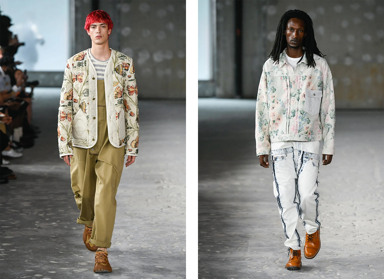 「JUNYA WATANABE MAN」26SSコレクションは、古きものの魅力と、その再現過程で生まれる新たな価値観にフォーカス。絨毯やソファ、カーテンに使用される豪奢な織柄のインテリアファブリックを採用し、変色、ダメージ、破れといったさまざまな加工を施した。なかでも、経年変化を思わせるジャケットやブルゾンは象徴的なアイテム。今シーズンも「Levi's」「THE NORTH FACE」に加え、「MACKINTOSH」「Barbour」、「BerBerJin」「NewManual」とのコラボレーションアイテムも展開予定。