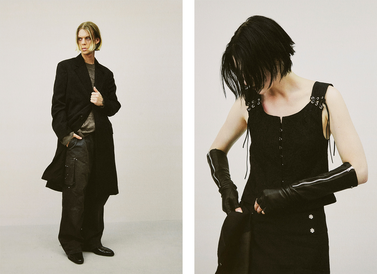 20周年を迎えた26SSレディ・トゥ・ウェアコレクションでは、あえてB面をテーマにブランドの記憶や出来事を再構築。いまの視点で過去を見直すことで、かつての未採用だったアイテムが意外性と洗練さを纏い現代的に蘇る。メンズでは、クラシカルなテーラリングにレースアップリケを組み合わせ、袖口やジャケットの裾から透け感のあるシルクを覗かせるなど、素材と構成によるコントラストを強調。ウィメンズでは、力強いフェミニニティとメンズウェア要素の再解釈し共存させたアプローチに。革新性を根底に持つアイデンティティを改めて提示し、ブランドは次なる章へと向かう。