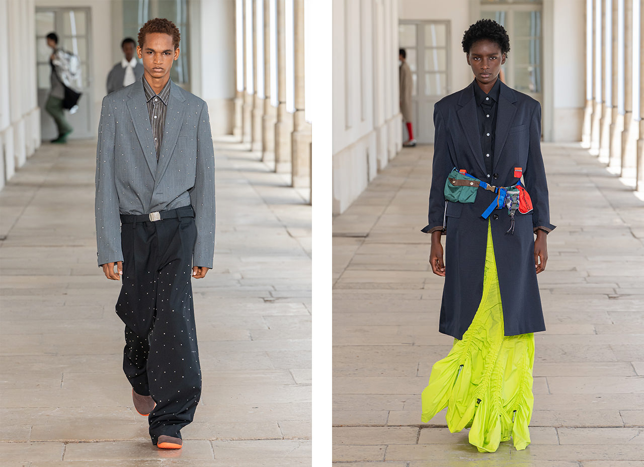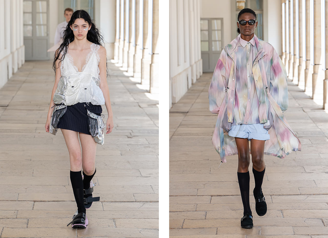 新クリエイティブディレクター堀内太郎のもと、新章を迎えた26SSコレクション。テーラードを基軸に、多様な遊び心で完成形を崩したスタイルを展開する。ビジューが輝くワイドパンツにはロングジャケットをイン。爽やかなブルーが目を惹くショーツにグラデーションのジャケットを合わせ軽快な佇まいを演出。カラフルなポーチを連ねたベルトや大きなポケットを左右に配したスカートなど、ディテールも目を惹く。レーストップスはアウトドアパーカをドッキングし、ドローコードでギャザーを寄せながら甘さを中和。対極する要素を交差させることで生まれる揺らぎが魅力。