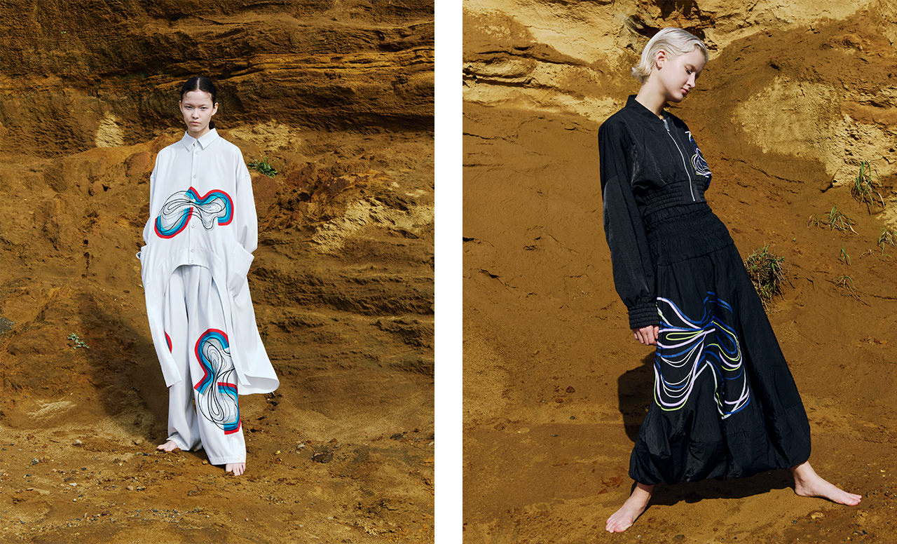 3つのアンチテーゼを掲げ、既成概念やファッションの枠を越えた自由な感性と独自の発想を追求するブランド。26SSコレクションでは、幾重にも堆積する「地層」をキーワードに、長い年月の中で刻まれてきた質感やレイヤーを、知的かつモードな視点で再構築。有機的な曲線が生む湾曲フォルムが立体感を生み出し、洗練された表情で身体を包み込む。アースカラーを基調に、ヴィヴィッドなレッドやイエローをアクセントにしたサイケデリックな色彩が未来的な印象を演出。着る人の個性を際立たせる唯一無二のスタイルで、春の装いに鮮やかな表情をもたらす。