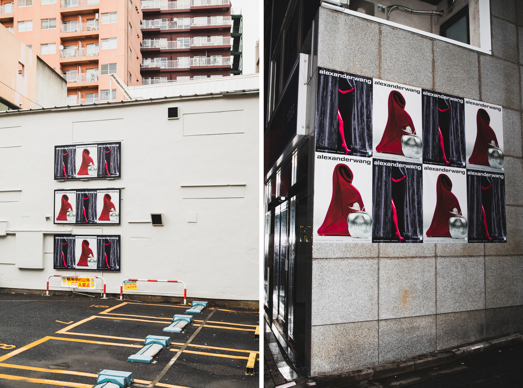2F「alexanderwang」の限定ビジュアルポスターがこちら。渋谷センター街近くの駐車場、スクランブル交差点からの脇道など、思わぬところに突如出現する様が、まさに広告ジャックにふさわしい。