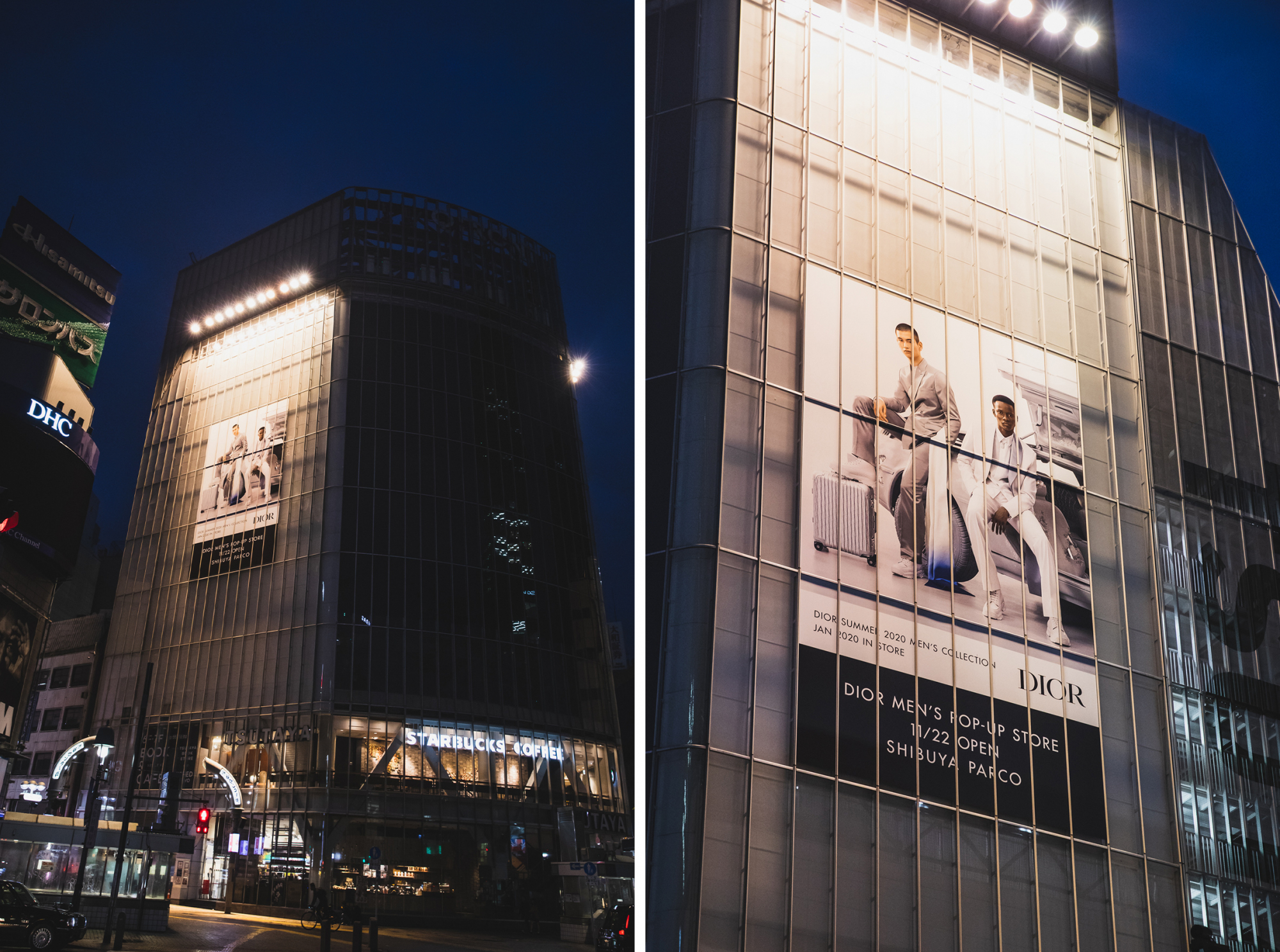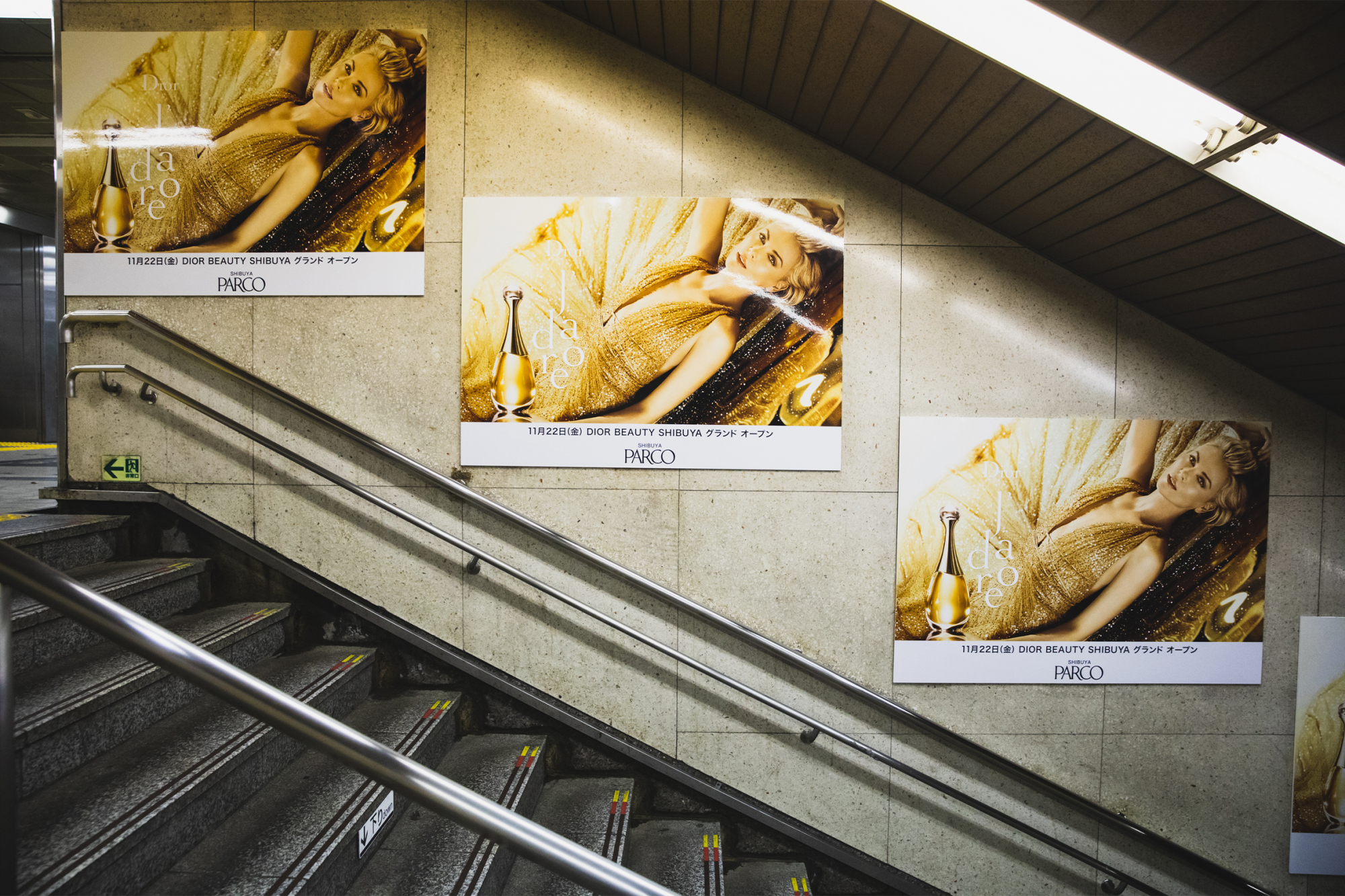 スクランブル交差点には、“DIOR and RIMOWA”CAPSULE COLLECTIONのビジュアルが。こちらは1FのThe windowで限定OPENの「DIOR MEN’S POP-UP STORE」によるもの。東京メトロ渋谷駅の人が行き交う階段には、「DIOR BEAUTY SHIBUYA」のラグジュアリーなポスタービジュアルも展開。