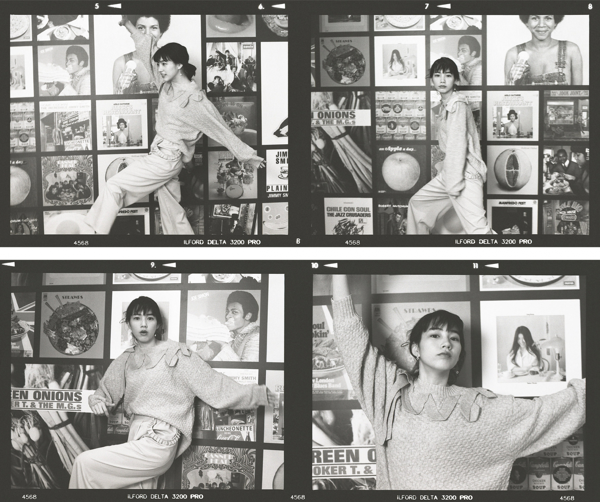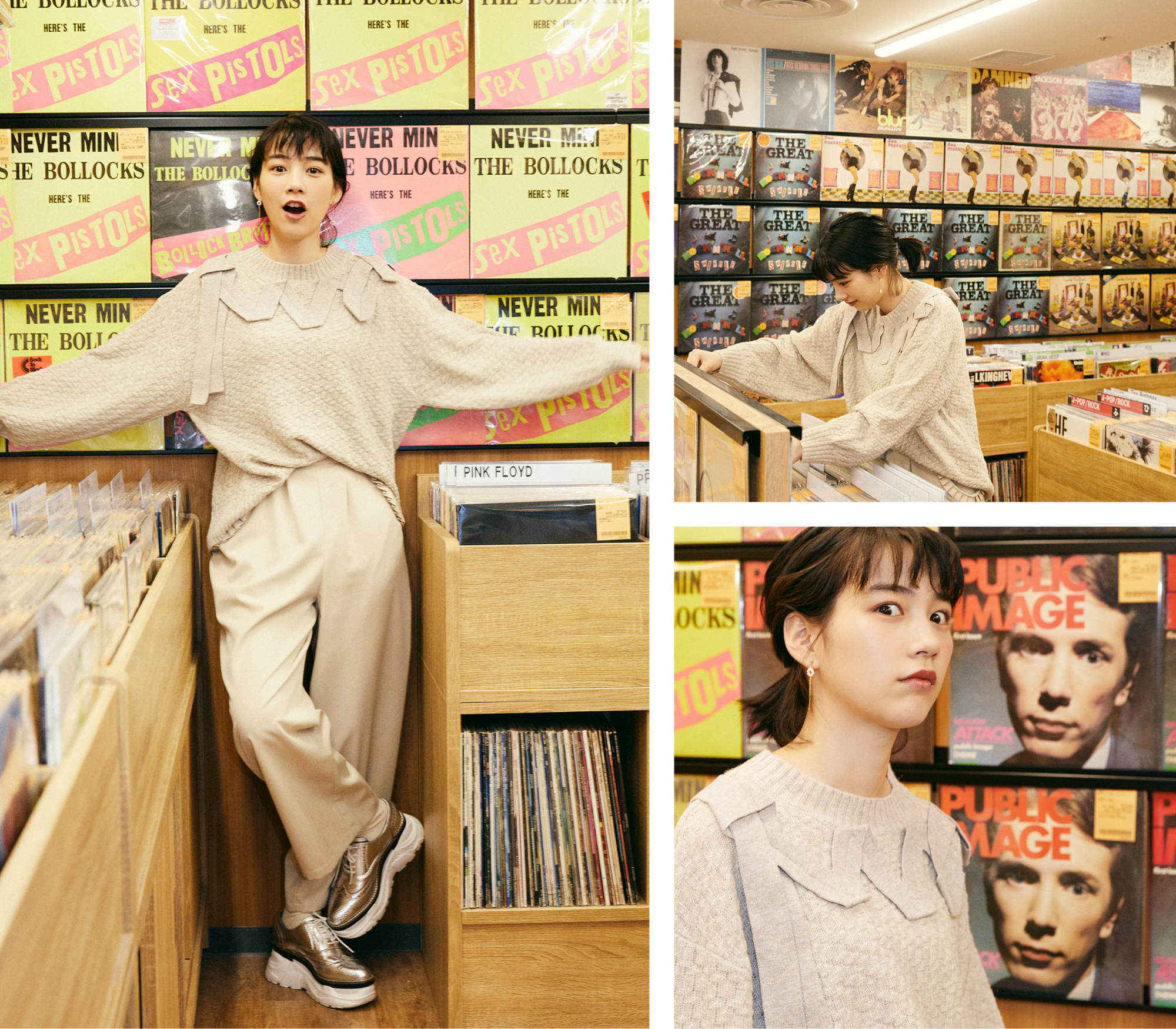 店内の棚はもちろん、壁のいたるところまでレコードだらけのアナログ好きにはたまらない空間。のんさんが訪れたこの日は、壁一面がセックス・ピストルズの「勝手にしやがれ!!」だらけに。ジャケ写が少しずつ異なるのは、販売国の違いなのだとか。コレクターの心をくすぐる品揃えに注目だ。「実は私、Public Image Ltd.のJohn Lydonに似ていると言われたことがあって、表情をちょっと研究してるんです」と、カメラにJohn Lydonのモノマネ顔を披露してくれた。「あれ、さっきの方が似てたかな……?」真剣に顔マネする、貴重な瞬間をキャッチ。