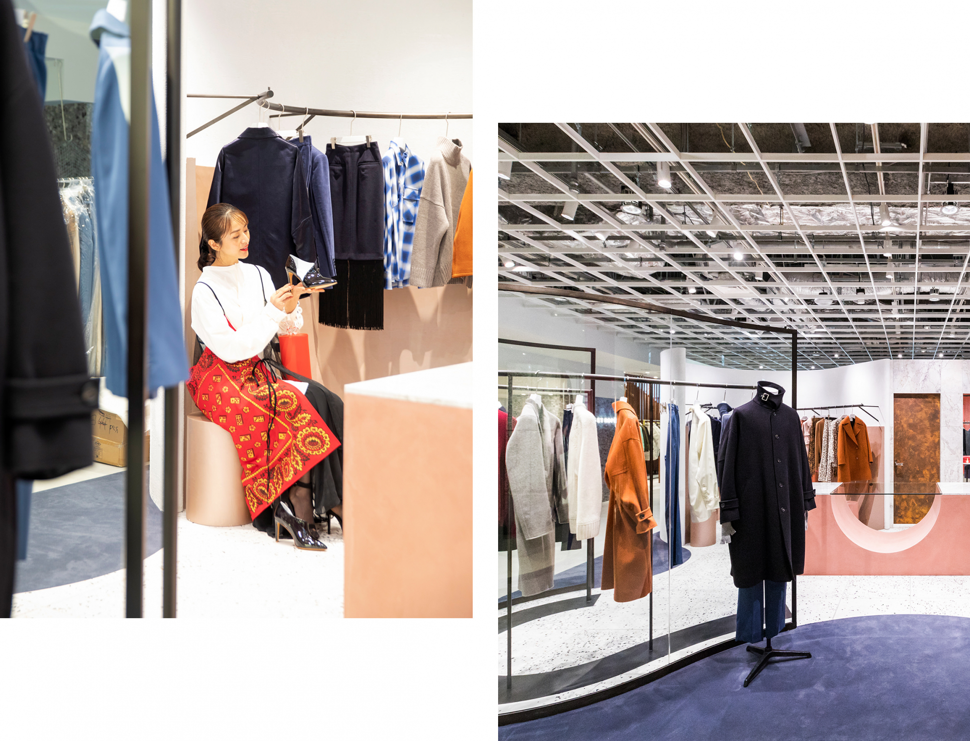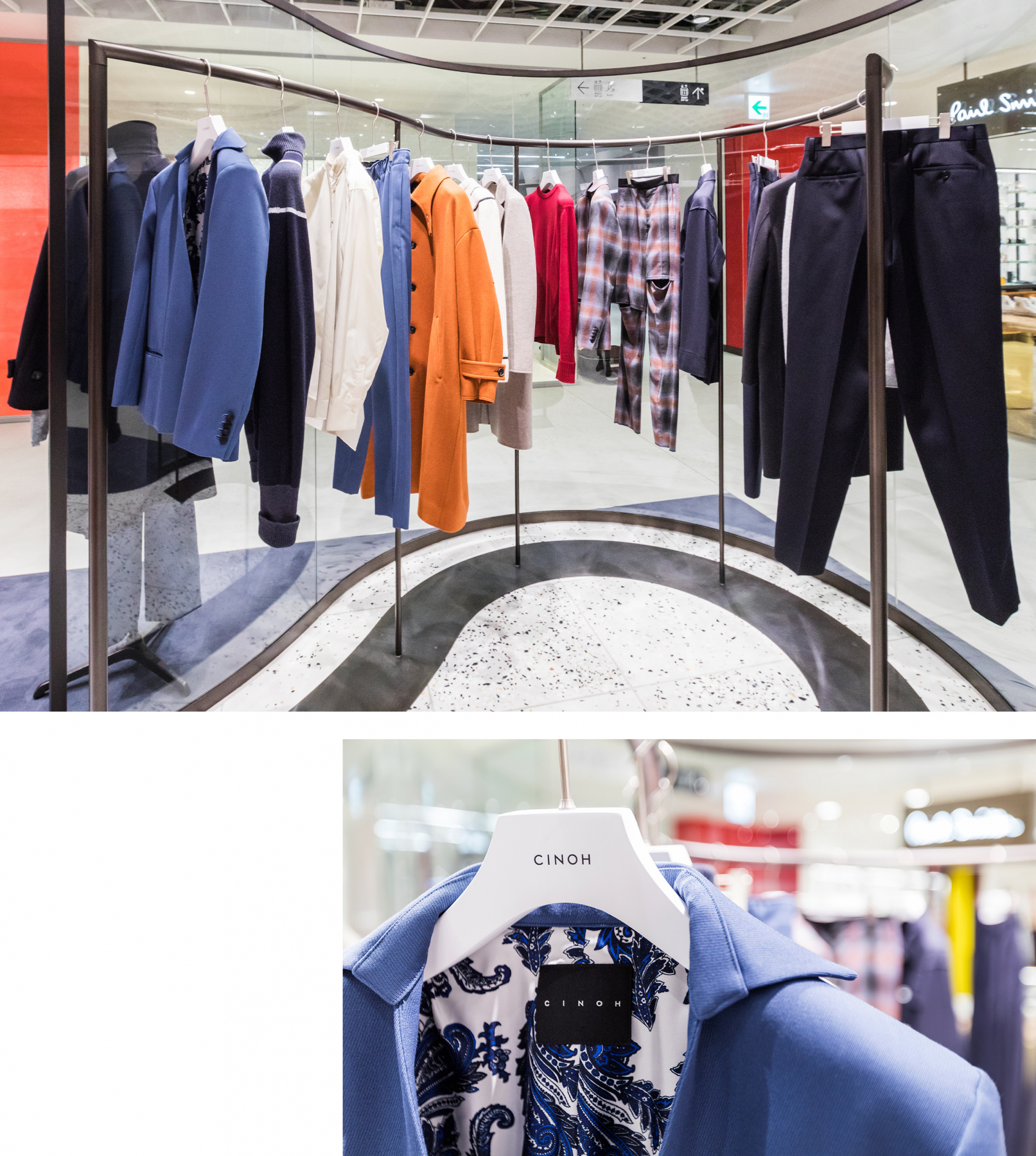 高品質の素材と細部にまでこだわったパターンテクニックを元に、大人のリアルクローズを提案する「CINOH」。 “スケートボードパーク”の世界観をコンセプトにした初の直営店は、渋谷という立地ならではのストリートカルチャーを融合したもの。鉄錆などのテクスチャからから大理石までをMIXさせたこだわりの内装や什器は、ドアノブ以外すべてフルオーダー。インテリアにこだわりを持つ佳子さんをまず虜にしたのは、ショップの内装や什器。「ホワイトとダスティピンクの色の組み合わせが素敵。抜け感があって今っぽいですね。 レディスとメンズが同時に見られるので、自分に合ったサイズ感でセレクトできるのも嬉しい」。