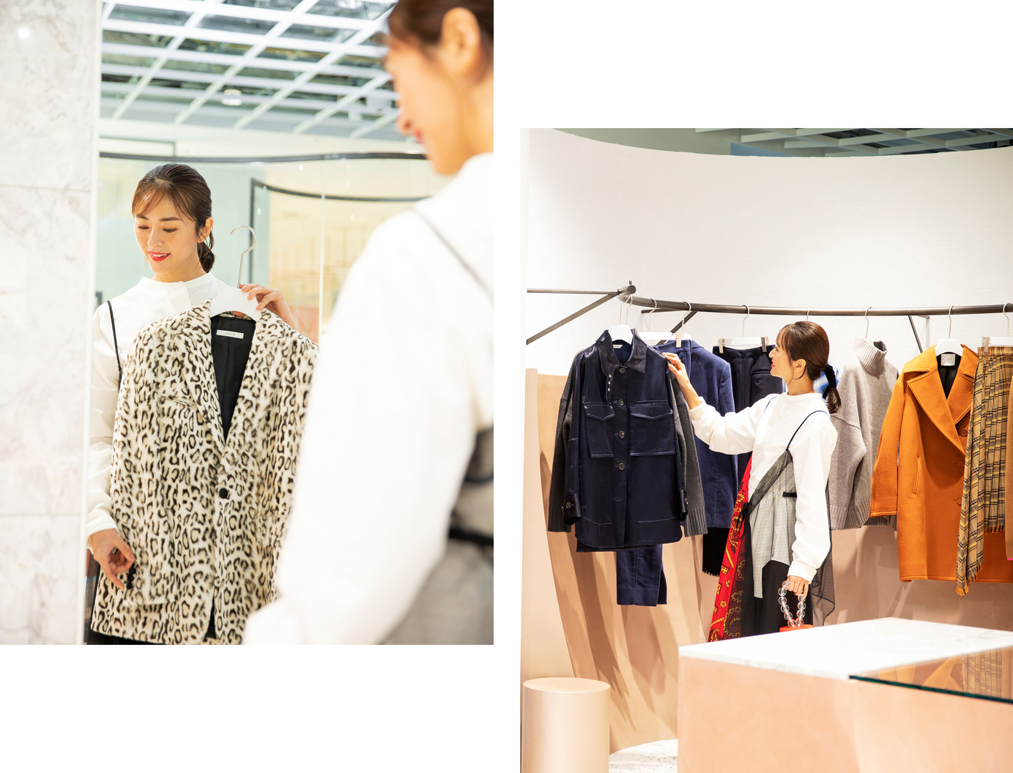 お店のアイテムを一通り見て回った佳子さんが手にしたのは、レオパード柄のセットアップ。このアイテムを今っぽく着こなすには?「今シーズンは、ジャケットスタイルが気になってます。おすすめはこんなレオパード。 派手になりがちな柄だけど、袖を通したときの着丈がきれいでエレガントに見せてくれそう。上下お揃いで潔く攻めたいですね」。