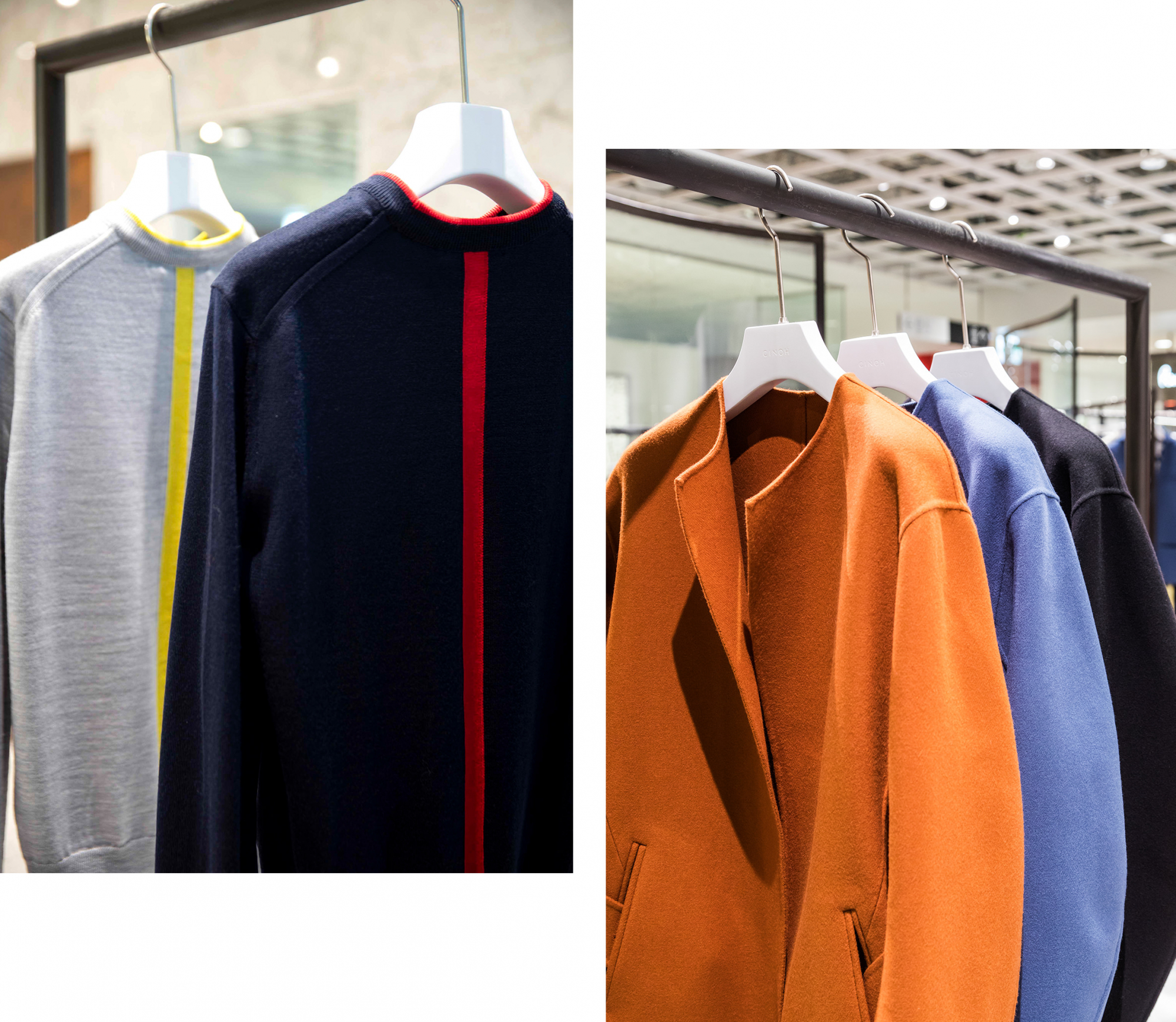 渋谷PARCO限定のNECK DECORATED DREW NECK KNIT各¥28,000+tax、W FACE NO COLLAR各¥110,000+tax